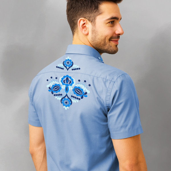 Výšivka sa nachádza na golieri a tiež na zadnom diely na sedle i pod sedlom. Je vo farebnej kombinácii 3 odtiene modrej. Košeľa je vkusne zabalená - čo je v cene produktu. Máte možnosť si podľa svojej predstavy zadať i iné farebné prevedenie . Napíšte nám to do poznámky pri objednávaní.