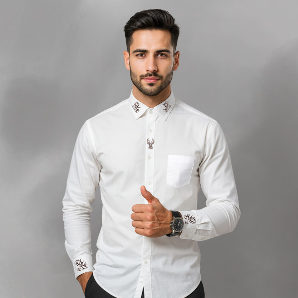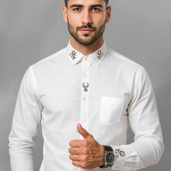 Výšivka sa nachádza na manžetách, golieri a gombíkovej lište. Je komplet celá v hnedej farbe čo nádherne vynikne. Košeľa je vkusne zabalená - čo je v cene produktu. Máte možnosť si podľa svojej predstavy zadať i iné farebné prevedenie výšivky. Napíšte nám to do poznámky pri objednávaní.