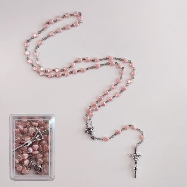 Ruženec je zabalený v bielej krabičke s priehľadným vrchnákom v tvare srdca. Korálky ruženca sú v tvare srdca, v ružovej farbe a spojené sú kovovými háčikmi.