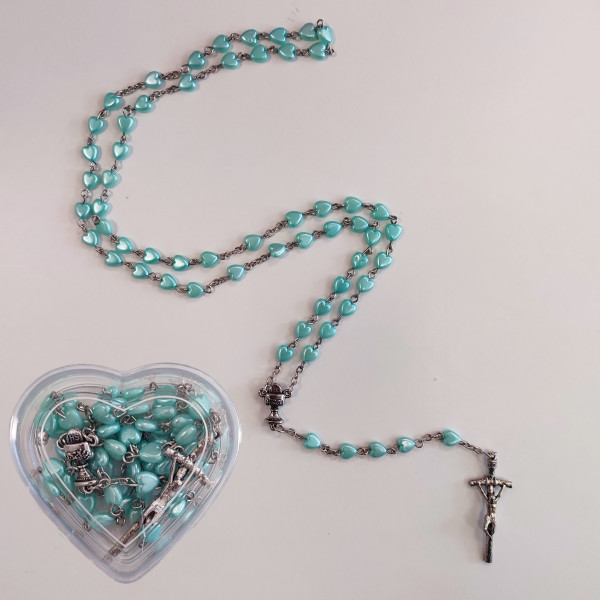 Ruženec je zabalený v bielej krabičke s priehľadným vrchnákom v tvare srdca. Korálky ruženca sú v tvare srdca, v modrej farbe a spojené sú kovovými háčikmi.